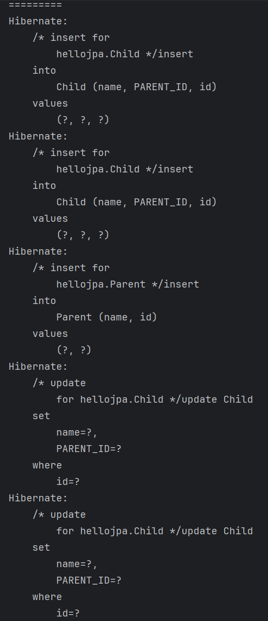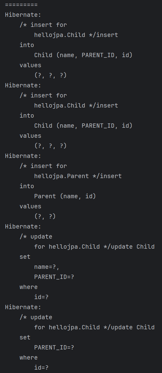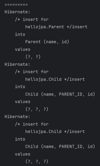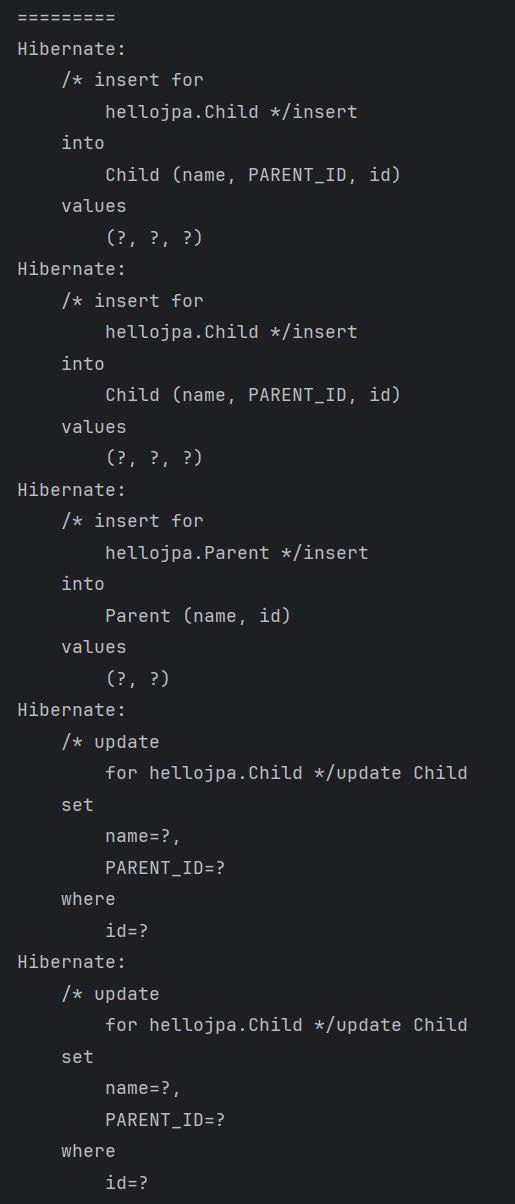 ๋ฐ๋ผ์ Child ์ํฐํฐ๊ฐ ์์์ฑ ์ปจํ ์คํธ์ ๋ฑ๋ก๋ ์์ ์ PARENT_ID (FK)๊ฐ NULL๋ก ์ค์ ๋ ๋ฒ์ ์ด ์ค๋ ์ท์ผ๋ก ์ ์ฅ๋๋ ๊ฒ!